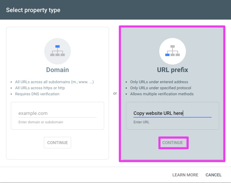 After clicking the link you will be taken to Google Search Console, here, a page with 2 options will be shown: