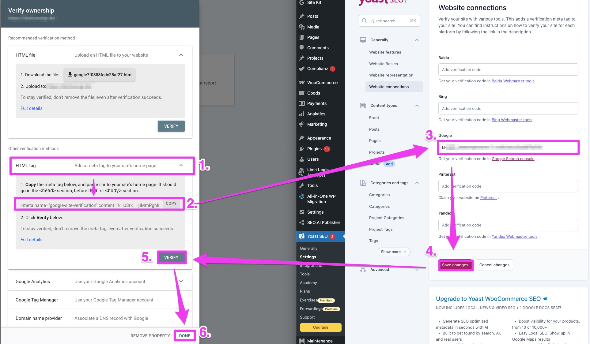 Now click HTML tag and insert the HTML tag into the Google field in Yoast, click save changes in Yoast before clicking the verify button in Search Console: