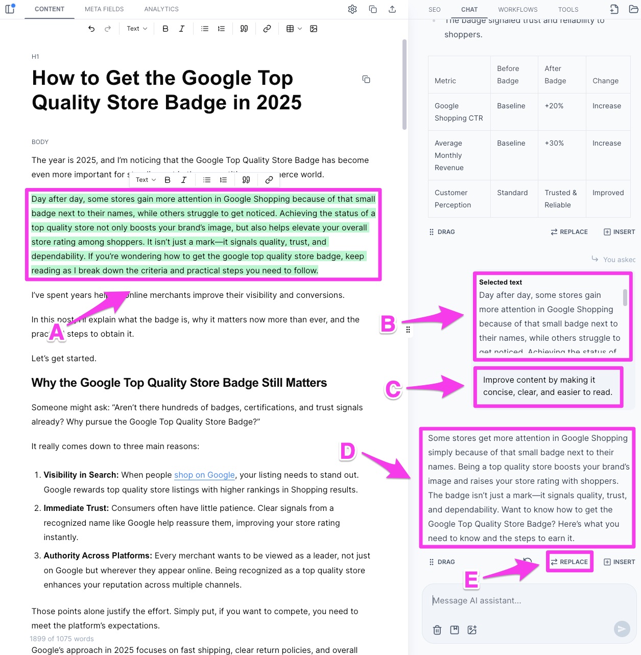 Use the cursor to mark text in the document (A & B) and prompt the chat to make changes (C). When you are satisfied with the text output (D), click "REPLACE" (E). The text (D) will then be replaced with the marked text (A) in the document: