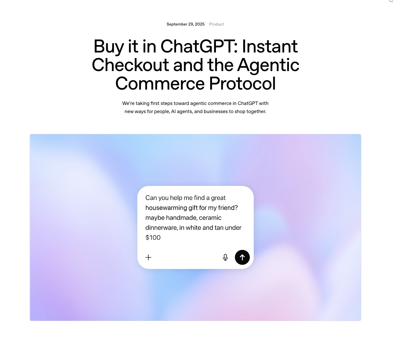 - Checkout → Instant checkout is being rolled out selectively (e.g., Etsy, Shopify).
